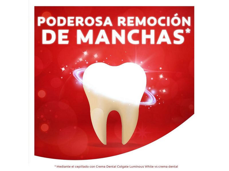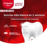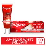 La pasta dental Colgate Luminous White Brilliant ofrece una efectiva limpieza bucal y eliminación de manchas superficiales, dejando un aliento fresco. Su uso diario contribuye a un blanqueamiento dental gradual y protección contra las caries - 50 ml